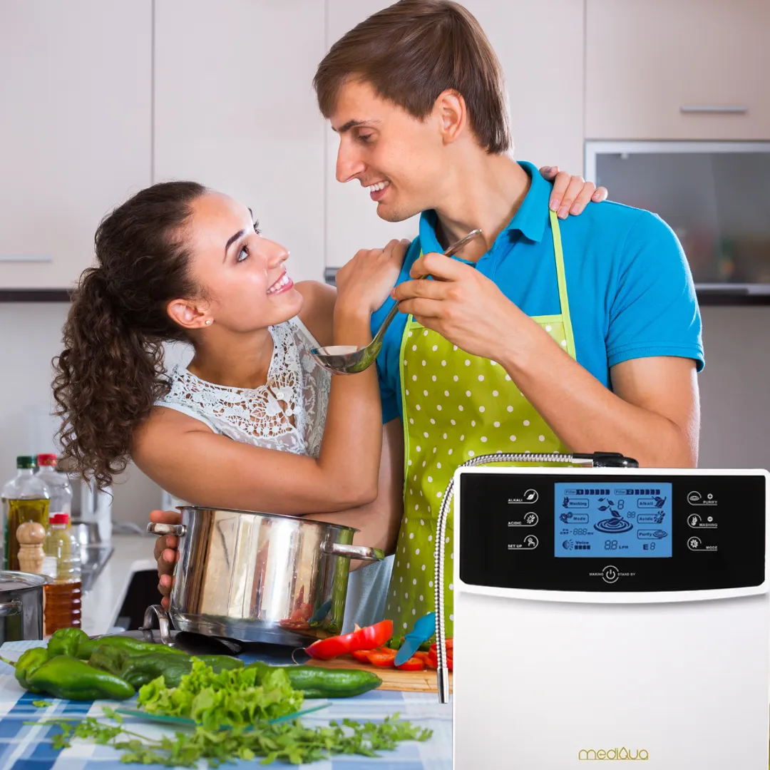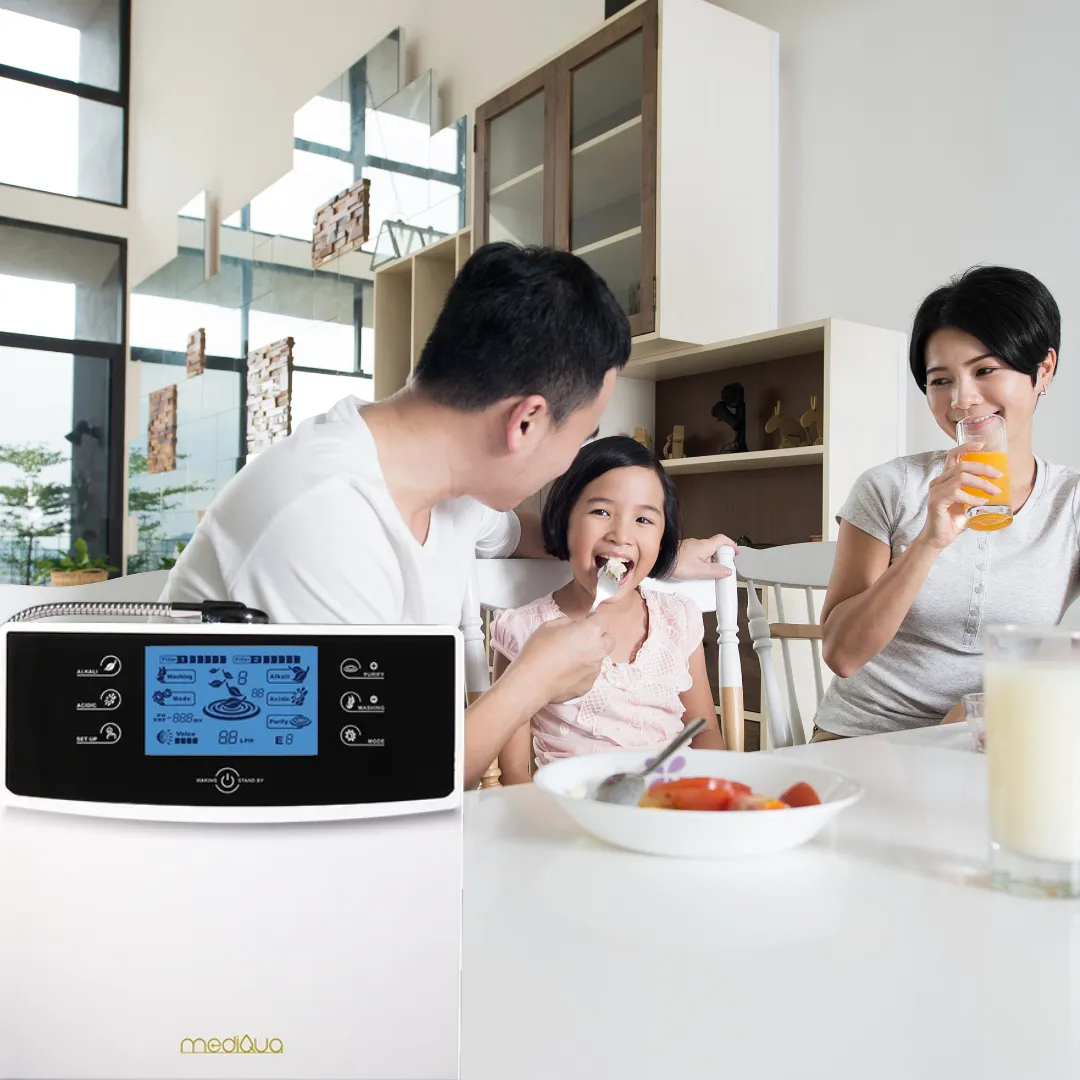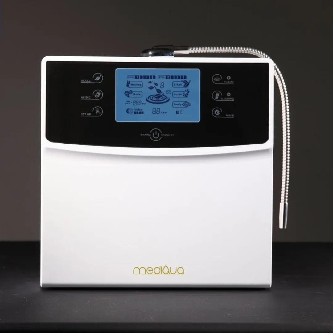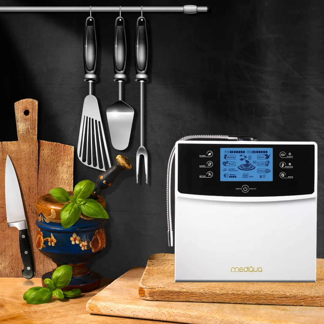 Máy Mediqua Alkaline thay đổi độ pH của nước, tạo ra nước ion kiềm giàu hydrogen giúp cải thiện sức khỏe và mùi vị nước